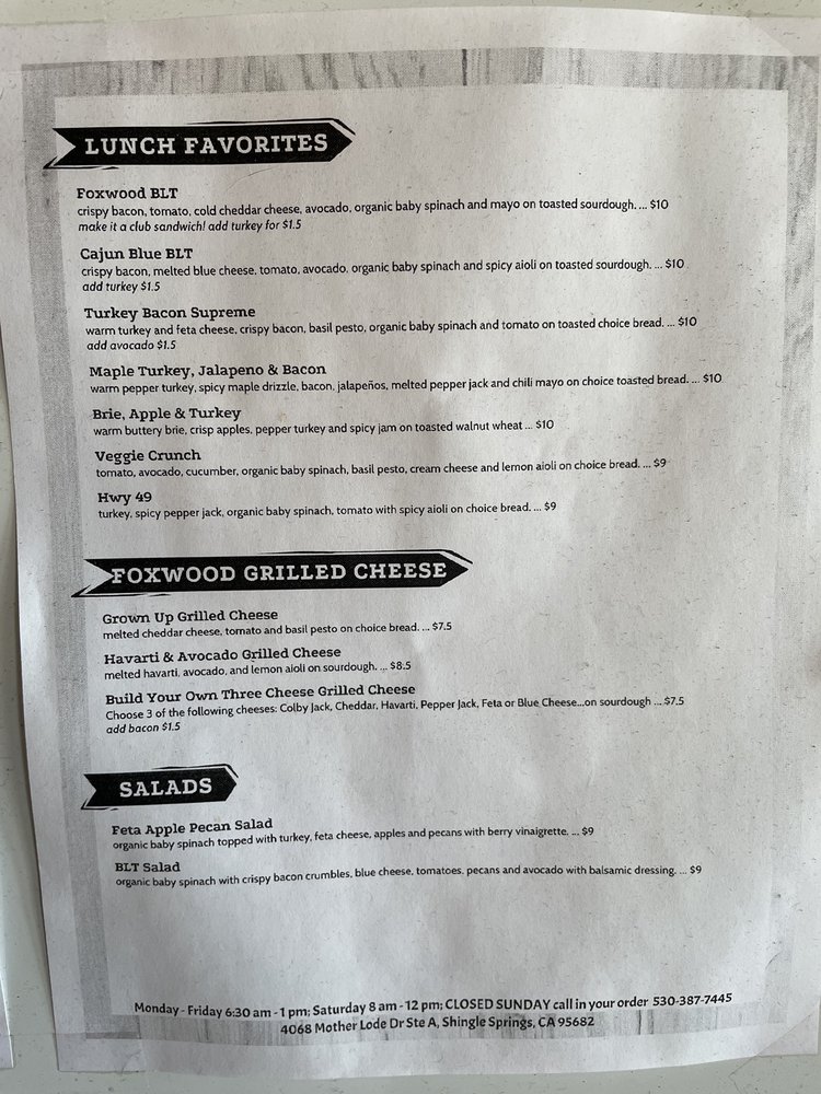Introducing the menu at Foxwood Coffeehouse, located in Shingle Springs, CA, a hidden gem for coffee and tea enthusiasts. This women-owned establishment offers a cozy atmosphere with indoor and outdoor seating, free Wi-Fi, and a drive-thru for convenience. Customers rave about the delicious breakfast burritos, creative drink options, and friendly service. The Mexican Mocha and gluten-free food options are highlighted, along with the welcoming staff and unique decor. Foxwood Coffeehouse stands out for its dedication to sustainability, with compostable containers, plastic-free packaging, and reusable tableware. Whether you're looking for a quick coffee on the go or a relaxing breakfast spot, Foxwood Coffeehouse is a must-visit destination for Northern California.
